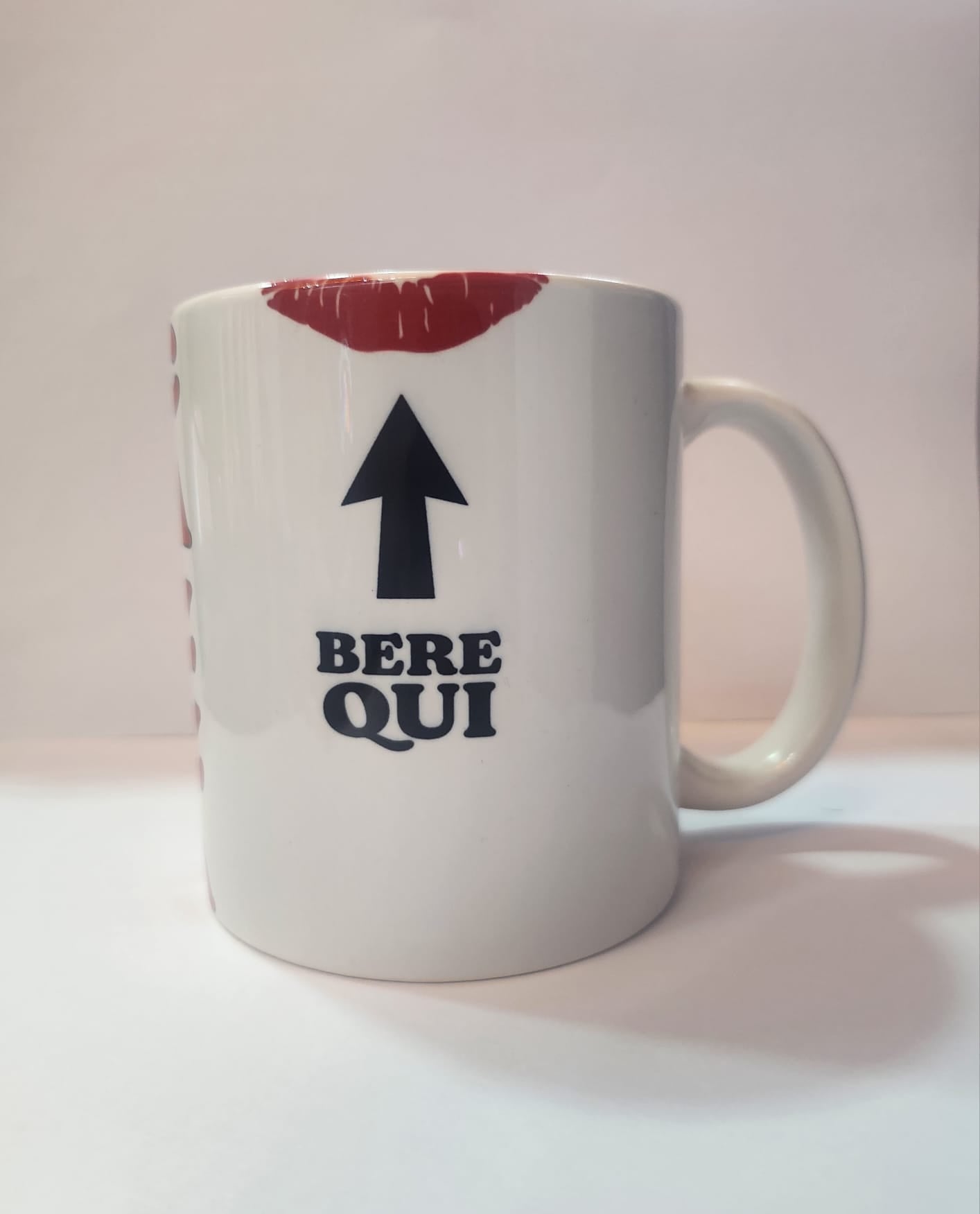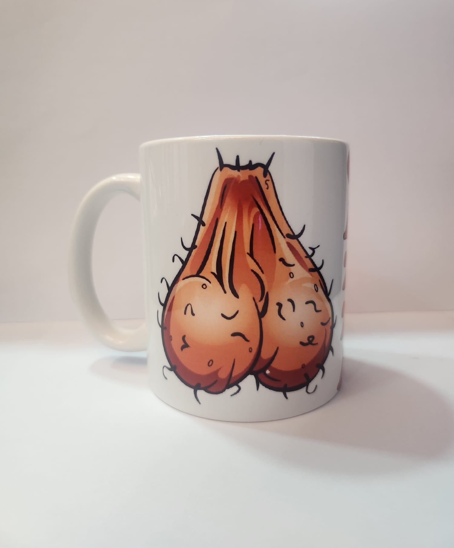 Tazza in ceramica con disegnato delle palle sul fronte, la scritta CAZZA al centro e sul retro le istruzioni d'uso!
